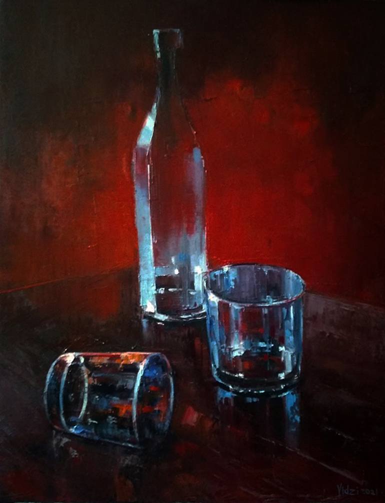 Still life with a play of light on a bar glass in dark red, scarlet tones.