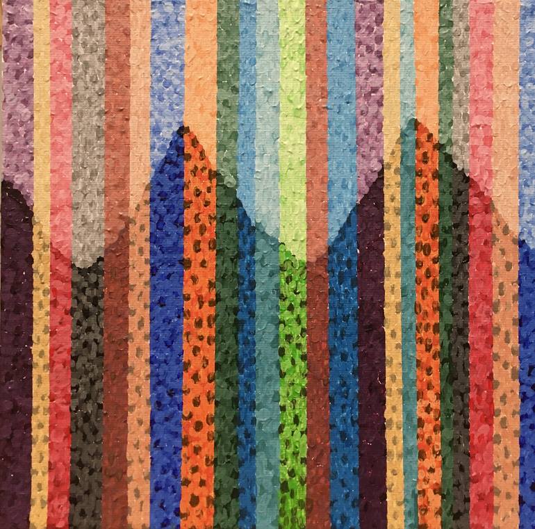 Having created my series of Barcode paintings using only dots of paint, I continued to experiment by using light and shade. Here I give the impression of waves and lines even though no lines or waves have been painted. I estimate up to 1000 dots of paint are in this work.