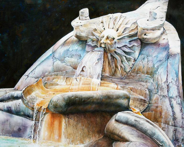 Detail of a fountain at the Spanish Steps in Rome by Alan Ewart, acrylic on canvas.