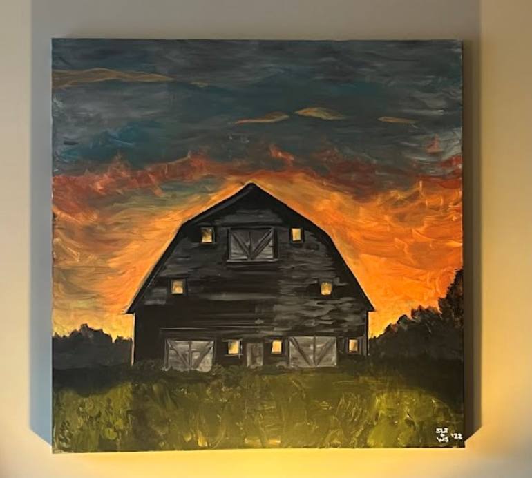 This is an old black barn from I imagined set against a sunset sky that is ablaze with colors of orange, pink, yellow, and red. The sky then fades upwards into darker, more somber colors of turquoise and gray-blue. There is a haunting feeling I get when I gaze upon this painting. One-of-a-kind signe...