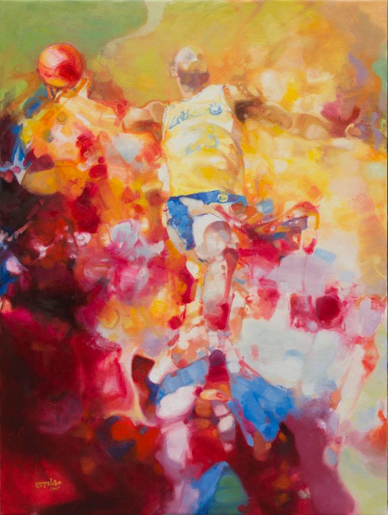 Abstract rendition of basketball player (Lebron James) in motion. Focusing on the interplay of shape, color, and brushstrokes.