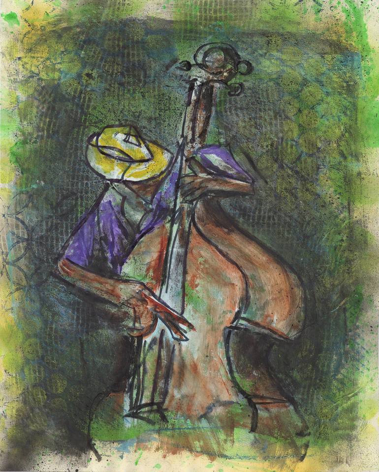 This is from my series of musician paintings. I've been going out and drawing live music in Brooklyn for many years. I carry small handmade sketchbooks in my back pocket and draw simple line drawings, mostly in the dark, so I really don't see the drawing until later. I've been taking those small dr...