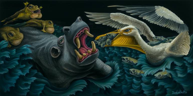 The unmistakeable style of Brady Willmott transcends categorization. He manages to couple the atmospheric perspective and quality of work associated to the Renaissance with a surreal twist that doesn’t feel forced. At first glance, the works appear fun and whimsical, but the viewer is quickly drawn in with a sense of deeper emotion. Born to a creative family of musicians and artists and raised deep in the woods of Vermont. Willmott started on the path to becoming an artist from a very early age. Often drawing upside down or with both hands, it was clear that he had a unique perspective. During his high school years, his commitment to art led him to take vocational art classes, night art classes at a local community college and a summer program at Parsons School of Design in NYC. In 1998, he earned a BFA from the School of the Museum of Fine Arts, Boston with a focus on oil painting. While in college his love for lowbrow influences of skateboard graphics, hotrod style art and graffiti fused with newer interests in surrealism and old masters work. He was developing a distinctive style by graduation, but that would have to wait. Snowboarding and traveling the country had taken priority. Inconsistent living conditions weren’t conducive to having space or opportunity to paint and he turned his focus to tattooing. Tattooing brought Willmott to settle down in San Diego, CA in 2003. The “new skool” style of tattooing of the ’00s was his first niche but it wasn’t long before traditional Japanese influences started to creep in. For several years he occasionally painted in acrylics but soon picked up oils again and his love for painting was rekindled. Within a few years Willmott was showing his work in galleries across the U.S. and appeared in several publications worldwide. By 2017, he was participating in more than 30 group shows a year. It was becoming clear that there would be no better time to commit full time. The tattoo machines were hung up for good. A unique life has led to unique art that has been shown at multiple museums in the U.S. and Greece, has been a draw at large festivals and has been shown at more than 35 galleries on three continents.