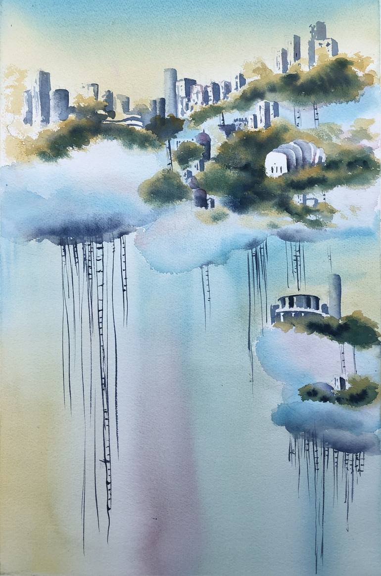 This surrealist cityscape is part of my "Invisible cities" series, inspired by Italian author Italo Calvino. Bauchi is a city up in the skies. I added some recognizable Tel Aviv buildings to it to make it more like home As in all my works I use watercolor on Arches 300mg rough paper