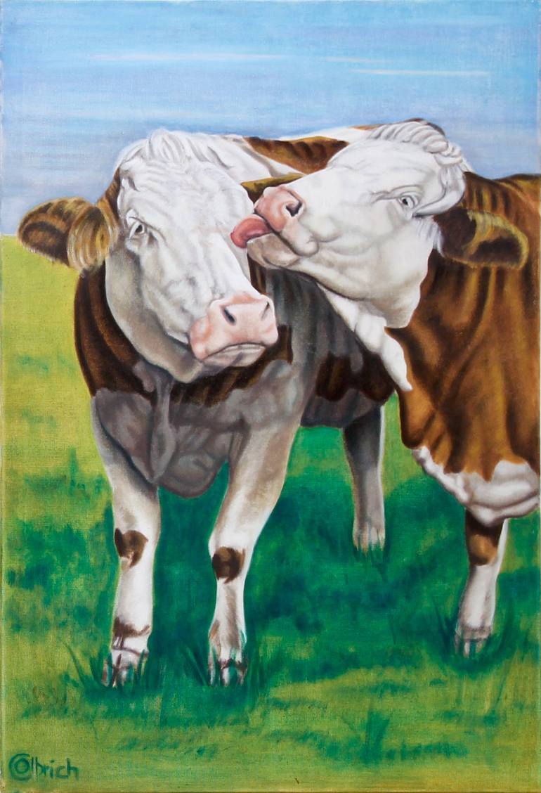 The cows are a natural institution in the mountains of Bavaria. They belong to the landscape and show their very own personality. The painting is made in oil with several layers, so the figure and nature can show their depth