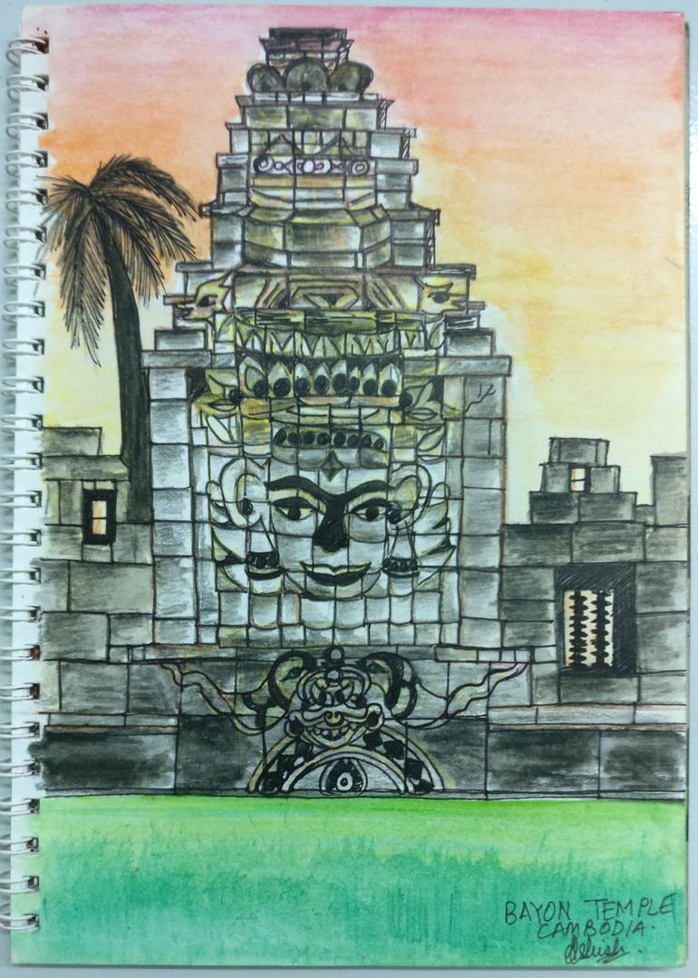 This Painting was made on site at the famed Bayon Temple, Cambodia. Major highlight of the temples which includes the unique faces on temple shikhars has been tried to capture.