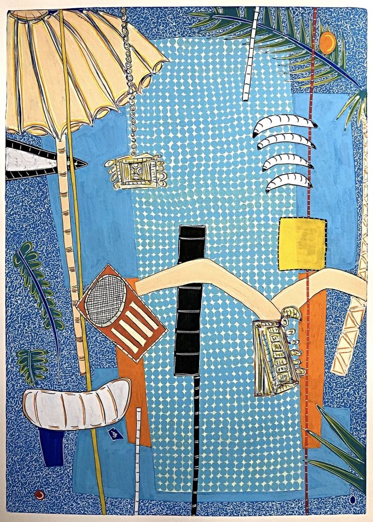 Alec is an artist who works internationally, having spent several years working and living in Delhi, India. Now back in the UK, he is developing and processing the vibrant multi-sensory stimulus that he discovered whilst living in such a vivid place, as well considering other places he has spent lengths of time in throughout his life, such as California and Sri Lanka. This multi-sensory sense of movement within place translates into a ‘pan global’ vocabulary evident in his mixture of Western/Eastern influence in his painting style. His practice, oil on canvas, is traditional in medium, although the images that jump in and around the canvas are vibrant and playful, exploring the concept of fleeting moments. Within his abstracted painting style there are shapes and forms that lead to suggestions of 'things'. This idea of semi-recognisable forms can suggest a narrative throughout the painting, these forms or shapes can appear through drawings, thoughts, ideas and lived or imagined experiences. The paintings he creates may suggest spaces he knows, vibrant fabrics or places, or perhaps a moment glimpsed whilst laying poolside, or even a collection of observed objects, such as tyres stacked on the road or a table laden with drinks and paraphernalia. Many of these elements are enhanced by a desire to explore the way light in space, either imagined or real, enhances the compositions he allows himself to glimpse. This could be the bright harsh light that makes colours pop or a shimmering hazy light, recognisable from time spent in brighter sunnier parts of the world, California, India, Sri Lanka and Cyprus, The way it soaks its surroundings and makes the paintings vibrate, creating a resonation with this movement and moment, this creates an observation of the world through an imagined place, a playful space that translates into his own vocabulary on canvas