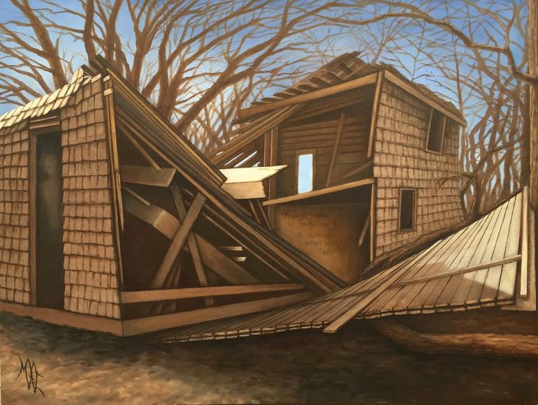 Painting: Oil on Canvas This painting is part of a series about the irony of wishes. The shadowy figure in the doorway of the destroyed house wished to live forever, not realizing they would outlive everyone one earth. There is a poem painted as graffiti on the back wall that reads, "tho nature red...