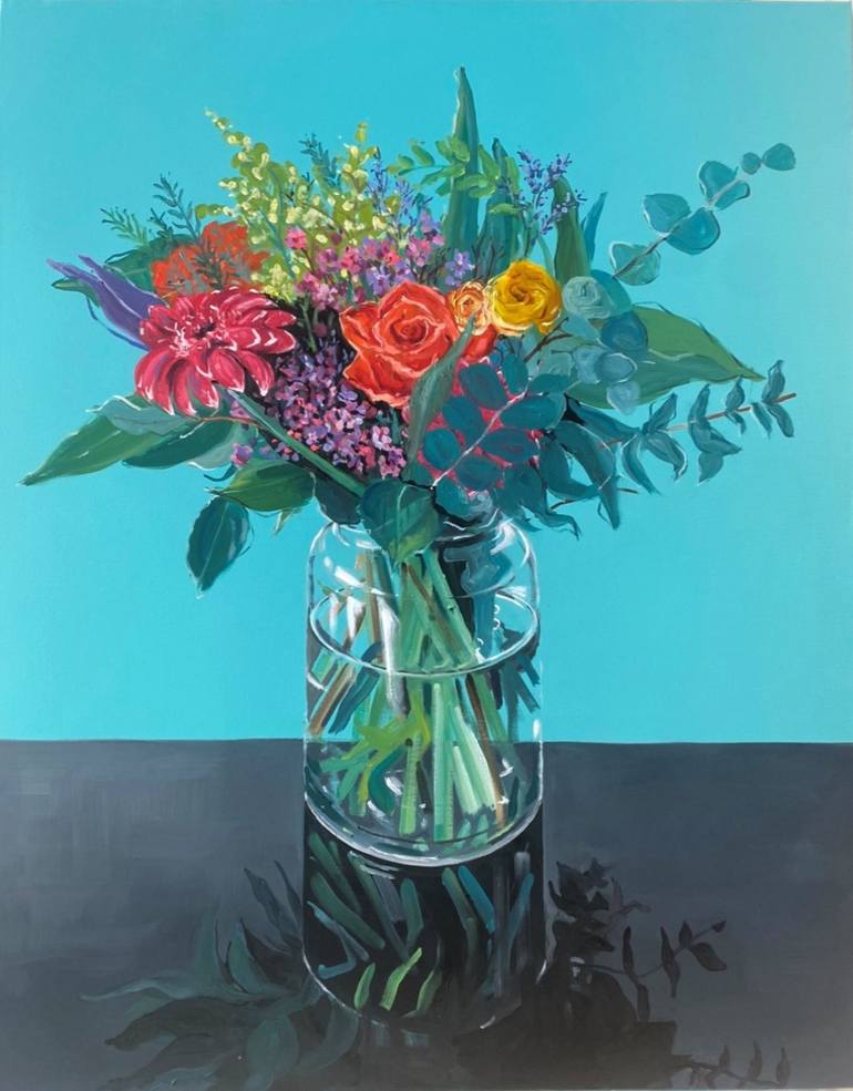 It was inspired by a bouquet of flower that was given to me for Valentines day by my husband. I hope the painting will be uplifting and there is no need to water them. My chosen medium is oil on canvas as the colours are bright and the brush strokes vibrant.