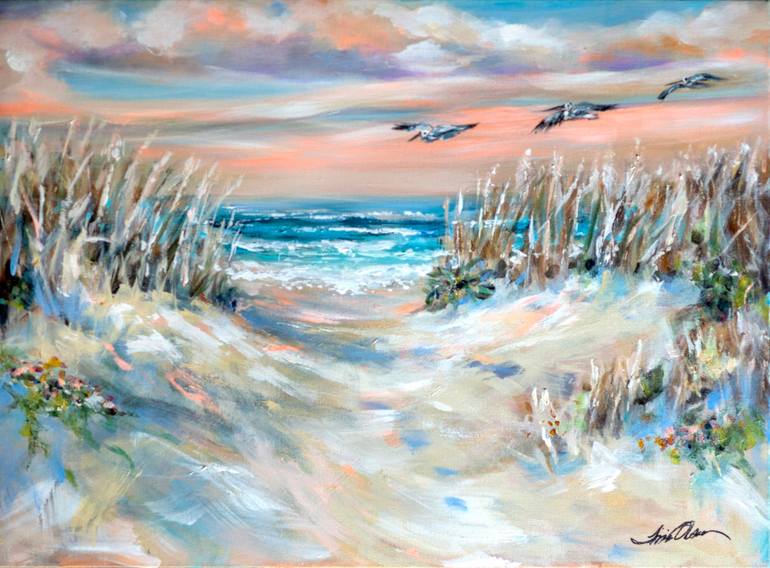 This painting has many layers of different colors to achieve an impressionistic expression of the path to the beach through sand dunes. Pelicans fly over the dunes .