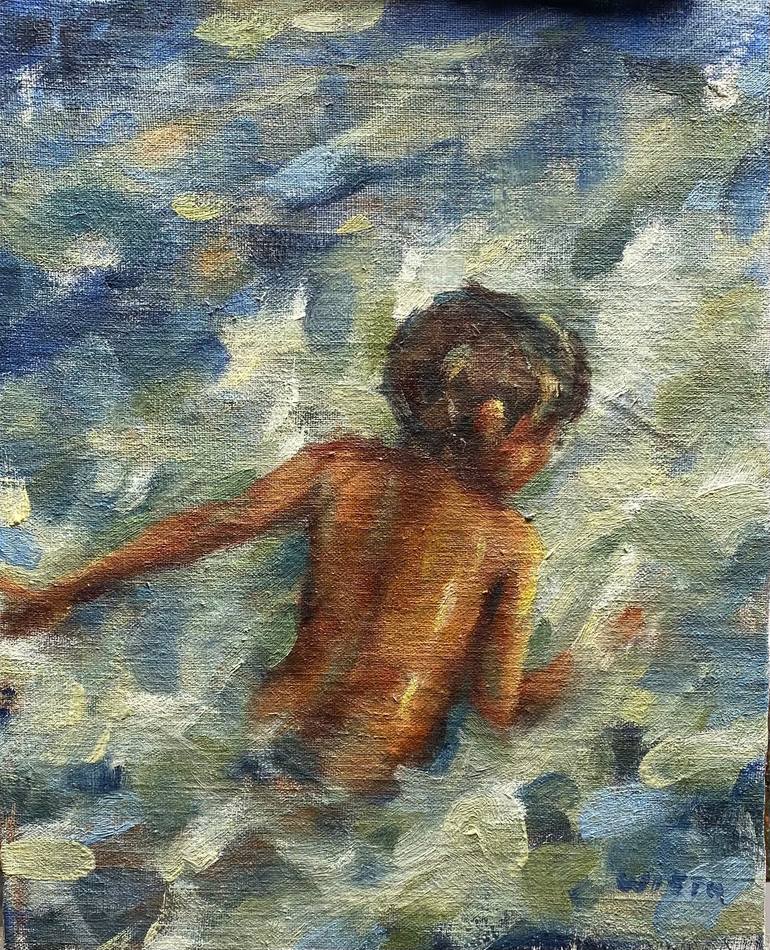 I love painting kids playing in the surf. It is a universal simple joy of youth. I love the figurative aspect as well as the motion and spontaneity of the water. This is oil on canvas mounted on a board.