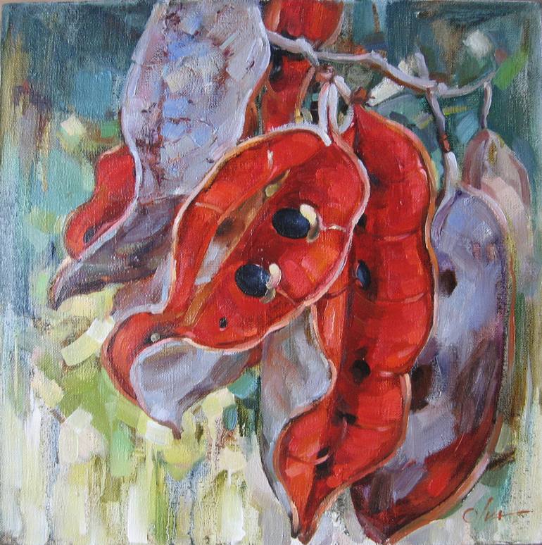 Once I saw some stitches on a plant of amazing beauty. They were silvery on top and those that had already opened were bright red inside. Blue black seeds. I just called them beans. Very beautiful. I could not resist their brightness. So I wrote such a vivid decorative picture. To paint these wonder...
