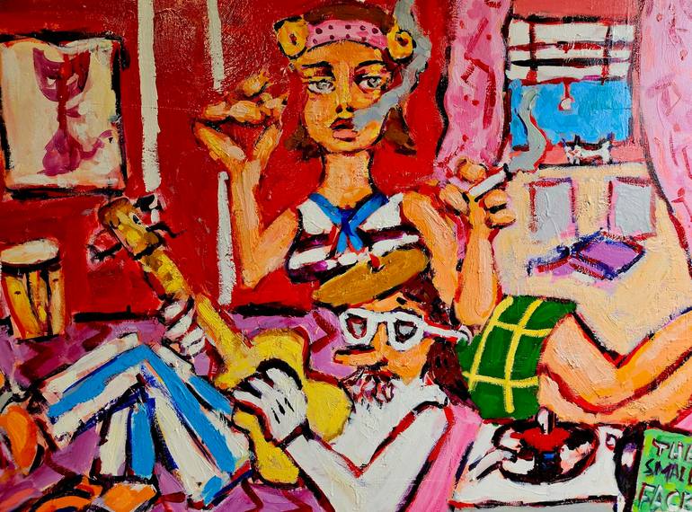 androgynous, iconic or mythological goddesses, cartoon-like characters, or abstracted forms. Exaggerated mannerisms, hand gestures, and different points of view are part of my abstracted figuration. I use gestural, painterly expressionism in a non-ironic way. My unique drawing style, combined