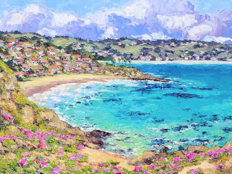 An original 30" x 40" or 76.2 x 101.6 cm textured oil painting of a Southern California Laguna Beach Seascape. Wild nasturtiums and iceplants growing along the foreground sea cliff frame the golden beach below. On the hillside beyond the cliff are Spanish-style houses and lush greenery and a few pa...