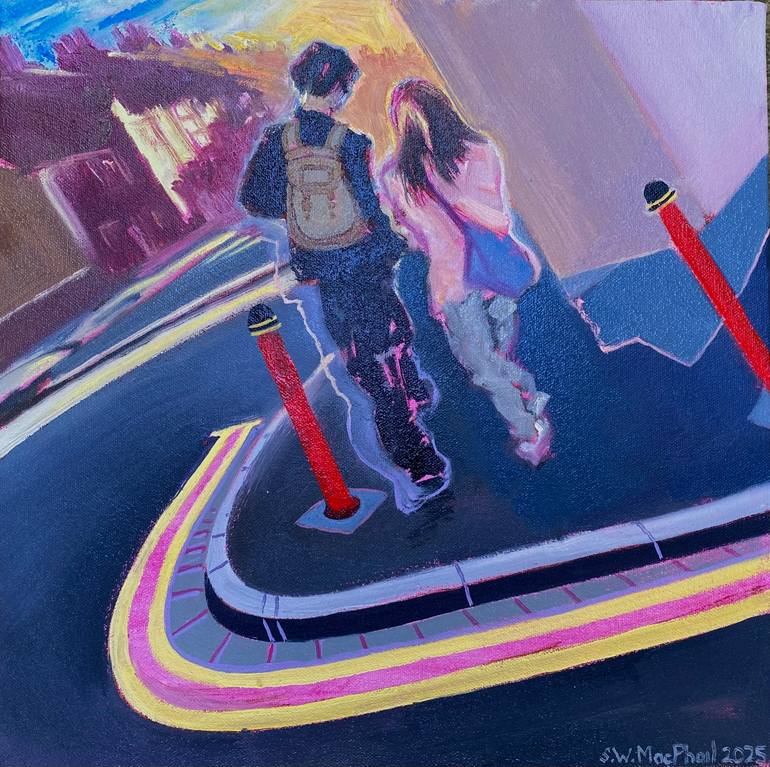 I observed how the morning sun lit the street at the top of my road. On another occasion I saw a young student couple engaged in close conversation on their way to school. The subject gelled in my mind as uplifting and potentially happy. I transformed and exaggerated aspects of the environment for d...