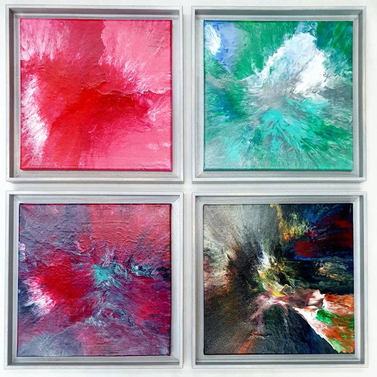 Acrylic paintings made on canvas. Very oriental spirit. Unique pieces, give a joyful and colorful ambience to your space. A shining layer of varnish is painted on top to protect from UV rays and dust. The artwork is made of 4 pieces. Each piece is 35 x 35 cm (before framing each canvas is 30 x 30 ...