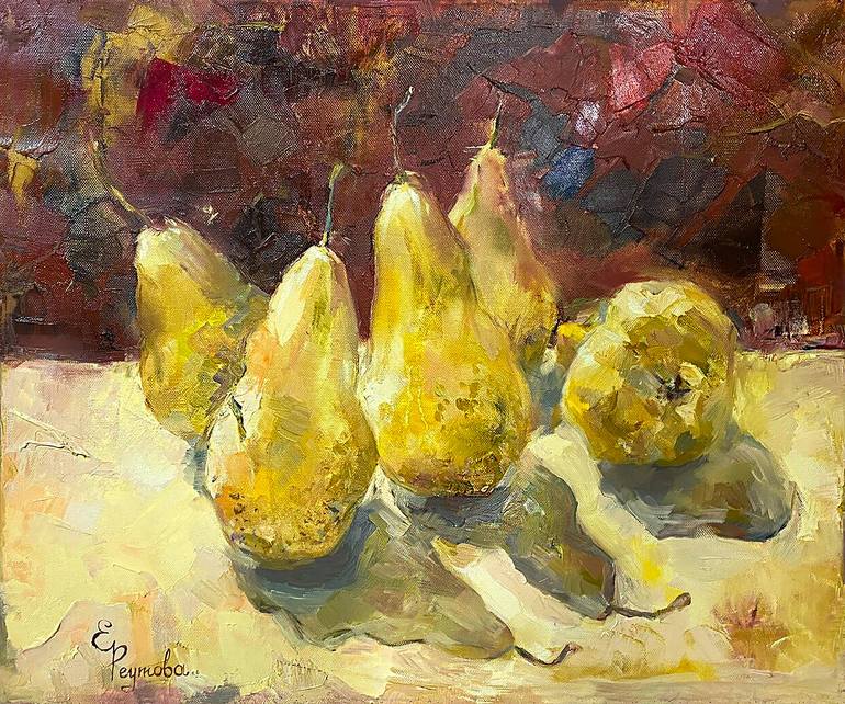 Beautiful still life with yellow pears on a rich brown background. Painting