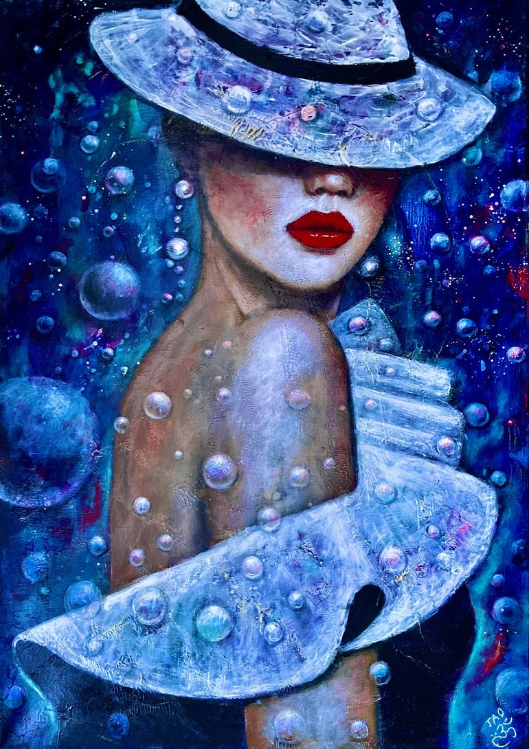 In this captivating gallery piece, a mysterious stranger in a hat brings an air of mystery and romance. Her eyes are veiled beneath a dark brim, casting playful shadows on her face and deepening the enigma that surrounds her. Her presence is an invitation to delve into the unknown, where secrets int...