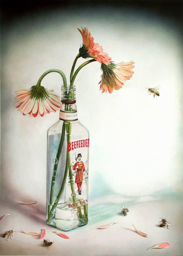 My watercolor paintings combine still life with narrative elements suggesting a pressing emergency or looming disaster. In this painting, honeybees become intoxicated and unable to fly as a result of sipping nectar from daisies that are soaking in gin, the brand of which has been subtly satirized as...