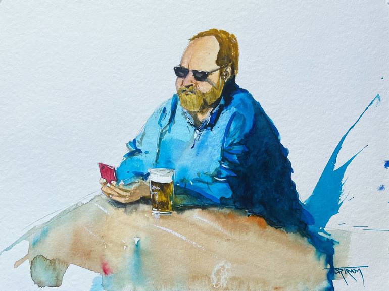 I enjoy my beer, both with friends and the solitary one. I too have a beard although not blonde but grey. This man on a sunny afternoon at a beach cafe was enjoying his beer while busy browsing reminded me of myself. I was in envy of him and I certainly wanted to paint the scene one day. And I did t...