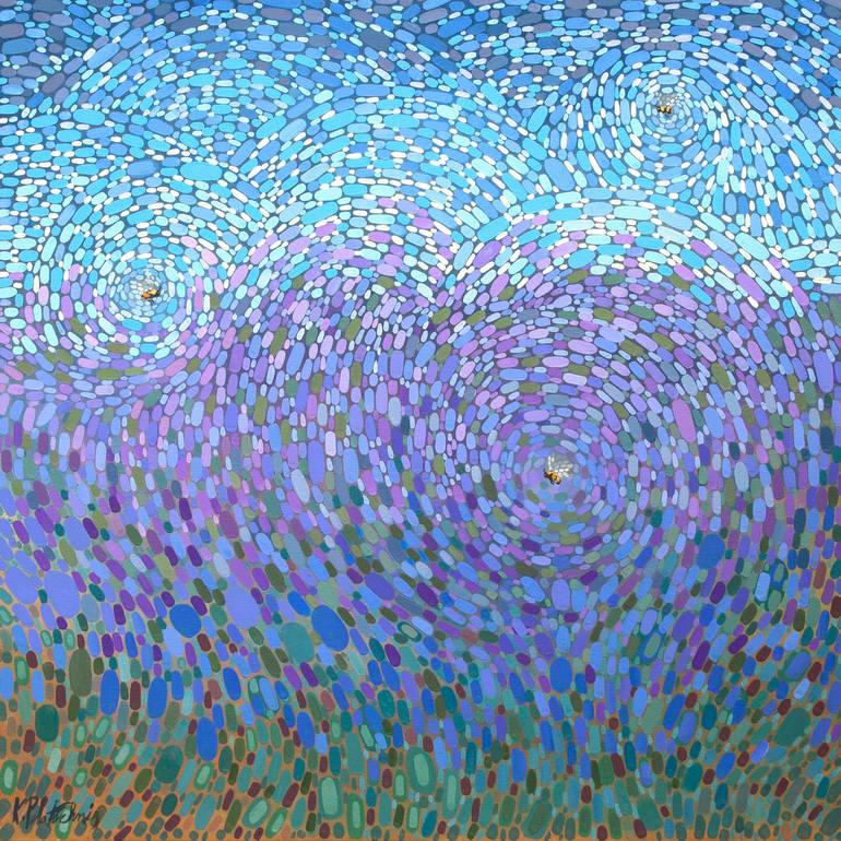 Bees in the Lavender explores flight and air currents. Swirls of air surround the bees, as your eye is led through the artwork with mosaic-like brushwork in an impressionistic style. 2022 Acrylic on Canvas