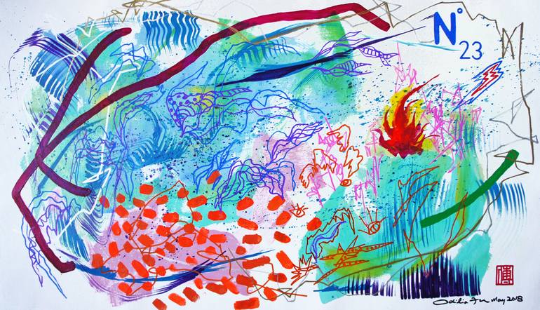 Acrylic, Markers on Canvas (420gsm Linen-Cotton Blend) Protected with Professional Varnish Unstretched Unframed - Ready for framing, NOT for stretchers (See extra photo) “Music in Ink” (墨樂) is a series of visual soundscapes interposed with the artist’s memories and sentiments which were then trans...