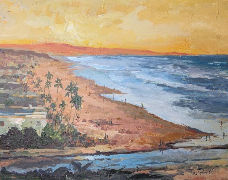 "Before Dark" captures the tranquil beauty of the coastline just before nightfall. Inspired by the warm glow of the setting sun, I used rich golden tones to create a soft, dreamy atmosphere. The waves gently roll onto the shore, where tiny figures walk along the water’s edge, adding a sense of life ...