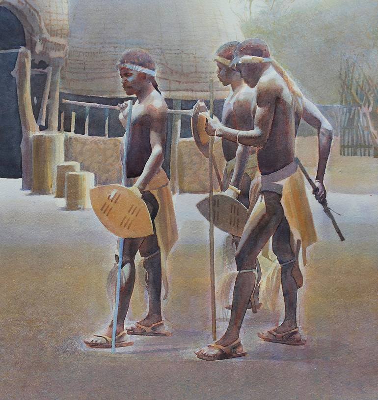 Before the Dance Watercolour on Paper In this watercolor, I captured the poignant moment of three warriors from the Zulu culture, bathed in soft, ambient light, as they prepare themselves, visually and spiritually, for an ensuing battle. Their figures embody strength and resilience, standing against...
