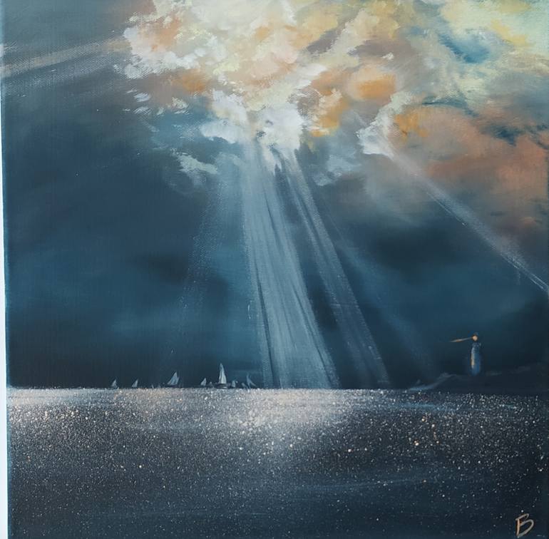 "Before the storm" - size 40/40 cm, oil on canvas. No outer frame. New, 2020. This painting is an attempt to recreate the special light before a storm. Dark clouds overshadow the sun. The last rays of the sun play with a special glow on the water. In the distance you can see boats and yachts returni...