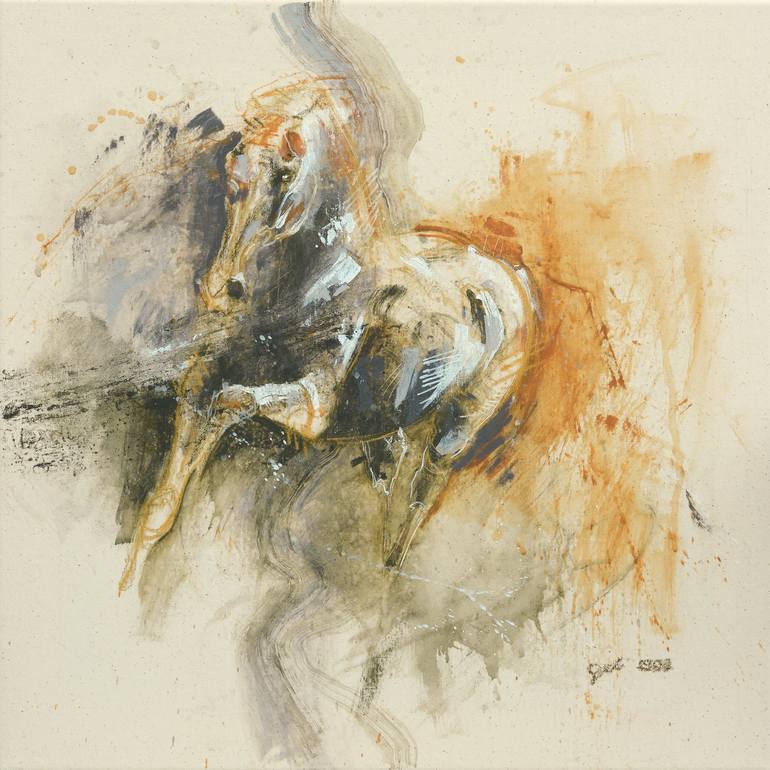 Born in 1975 in the Paris suburbs, Bénédicte Gelé lives and works in France, while exhibiting regularly on the international scene. She paints horses the way one explores an emotion: with attention, nuance, and depth. A passionate self-taught artist, her artistic path first developed alongside a career as an art director and graphic designer — a background that still resonates in the precision of her line and the balance of her compositions. Her connection with horses began in her teenage years, long after they had already taken over the margins of her school notebooks. Her first mare, bought at the age of 18, became a guide. Through observing her, Bénédicte learned to read emotion in postures, gestures, and subtle shifts — to observe without projecting, to feel without noise. In her painting, the horse becomes a raw land, sensitive and shifting, to be explored more than depicted. A living territory, mirroring inner states, made of gestures, silences, and traces. Formats and techniques vary depending on what needs to be expressed or brought to light. Semi-abstract painting, textures, fragmented bodies: everything speaks of instinct and inner resonance. Now fully dedicated to her artistic practice, Bénédicte Gelé explores the horse as a language in itself — both intimate and universal. The horse becomes a mirror, a messenger, a being as much as a language. Artist Statement For Bénédicte Gelé, painting horses has never been about representation. What drives her is what the animal brings to light: raw emotion, inhabited silence, inner resonance. The horse becomes a territory — a living, sensitive matter to explore rather than depict. A raw land where each brushstroke, each trace, reveals a fragment of humanity. Her semi-abstract work emerges from deep listening — to the body, to the present moment, to intuition. She works in mixed media, constantly exploring, layering, scraping, revealing. The line — rooted in her background as a graphic designer — remains central: at times structure, at times fracture, it guides the gaze through compositions where strength and fragility coexist. Each piece is a silent dialogue between the artist and the animal — and, in its own way, between the artwork and the viewer. Because if the horse acts here as a mirror, it is to help us connect more deeply with ourselves.