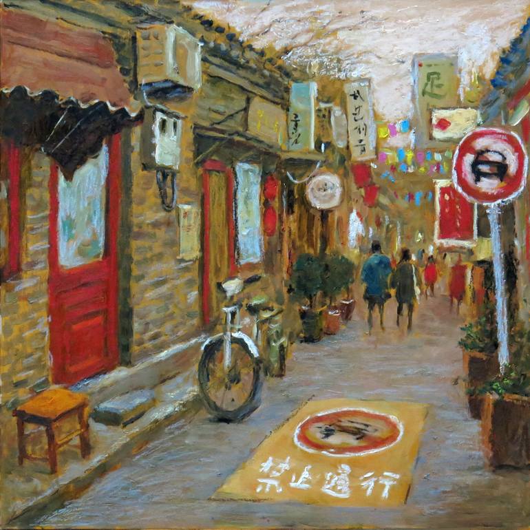 A Chinese hutong filled with brightly colored shops and pedestrians. A bike sits waiting outside a red door and do not enter signs forbid cars from pushing their way in.