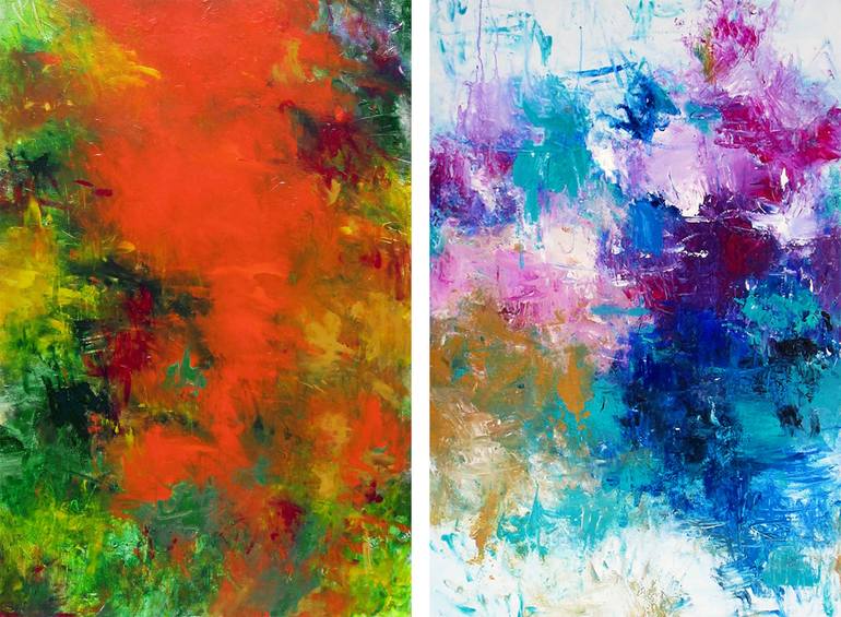 Two 24x36" abstracts....ready to hang The paintings that I create are meant to inspire and uplift, as well as enhance your interiors. I believe that our homes should be sanctuaries that surrounds us with comfort, color, beauty and the things we love. If you feel an emotional connection to a work, o...