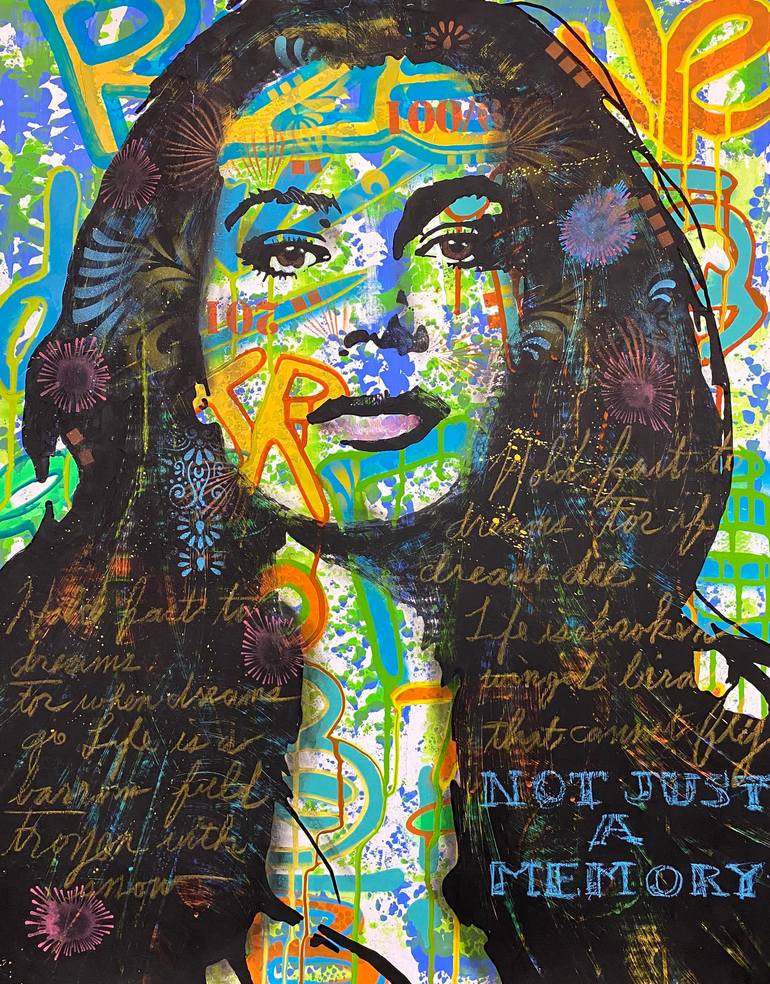 Title: Beleza This portrait reflects the peace, chaos, movement, and color we find behind the door in everyday life. Using layers I build up and break down the surface of the painting to find the balance for each subject. Materials: Acrylic, Oil, Spray Paint, and Graphite, on Heavyweight paper (Br...