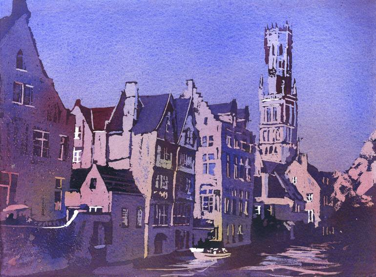Belfry of Bruges medieval bell tower in the centre of Bruges, Belgium. Watercolor painting of Bruges. Painted by artist Ryan Fox. Ryan Fox is a signature member of the American Watercolor Society as well as 6 state and regional societies- Northeast, Georgia, Illinois, Pennsylvania, Missouri, an...