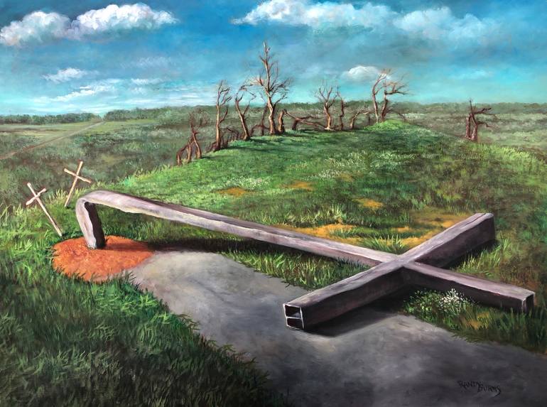 An F3 tornado caused this 70 foot steel cross to bend to the ground. Two small wooden crosses were slightly blown over, but were not damaged. High upon a bluff, this landmark was viewed for miles. The beauty of the area, the sky, the cliff and the power of a tornadoes dangerous winds inspired me to ...