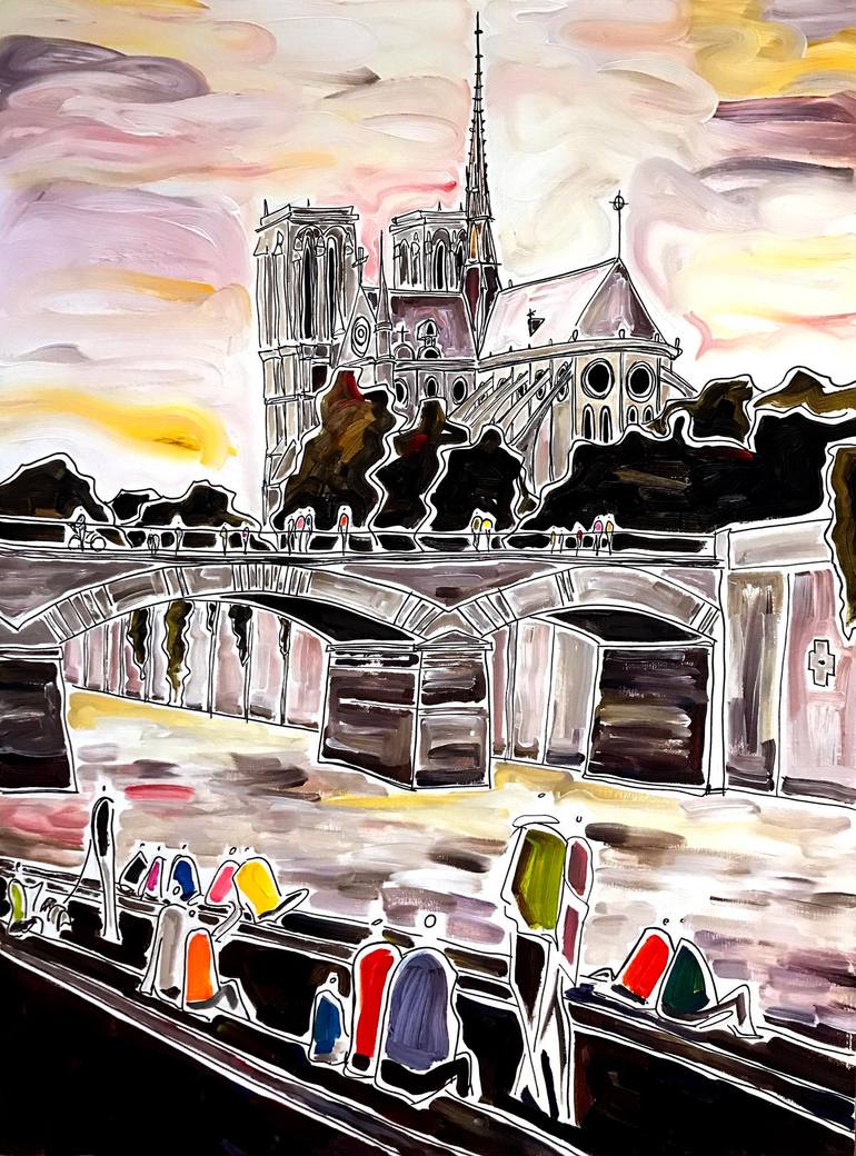"Les Berges de Seine" shows the movement and life that happens around the Seine with Notre Dame in the background.