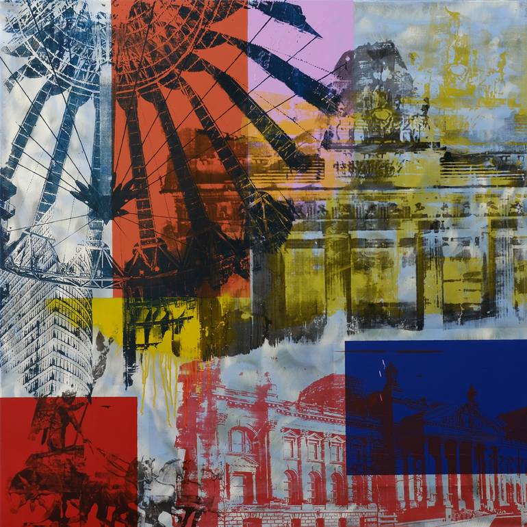 Berlin collage on gallery style aluminum. Screen printing technique combined with gestural painting.