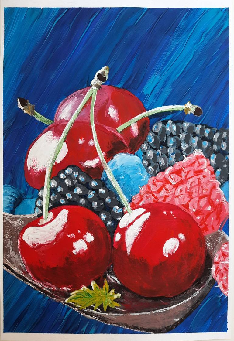 Juicy berries of different colors and shapes are located on a wooden plate: ripe red cherries, black blackberries, sweet raspberries, blueberries. Fresh and appetizing. A mint leaf decorates the composition and gives it a special freshness. This still life exudes pleasant fruity aromas and makes ...