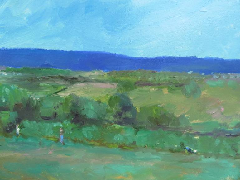 I saw these people picking blackberries and included them in my landscape painting. It added a whole new dimension to the painting. Painted in oil on a stretched canvas. The frame is not included.