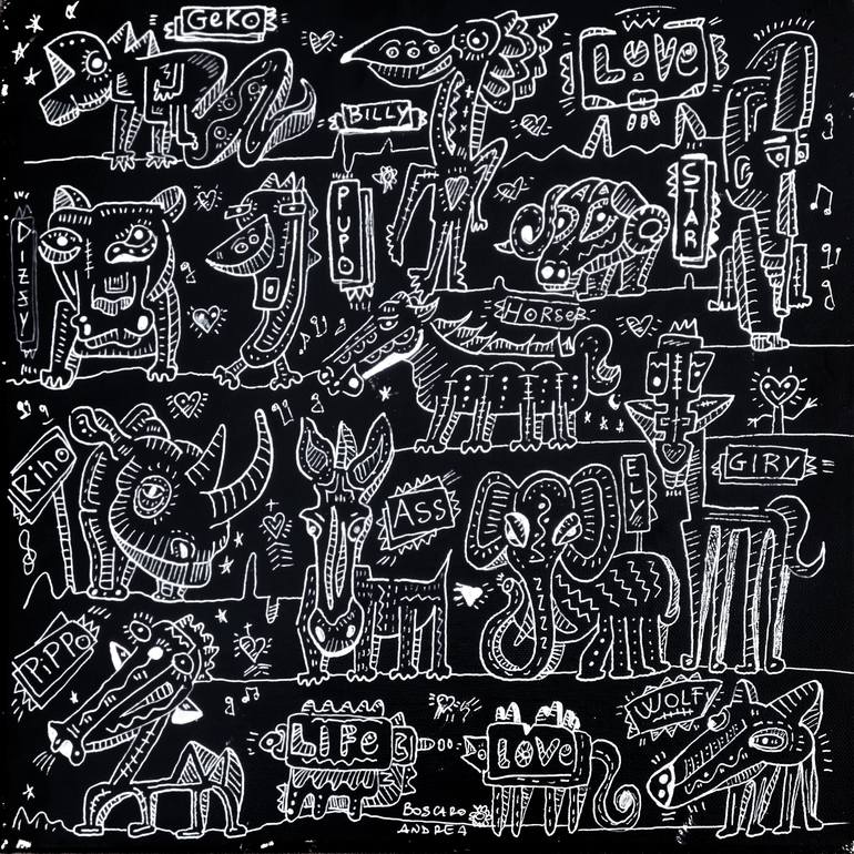 EMOTIONAL STORY OF THE ARTIST: My animals await prophecies, between a future that is in the making, and chatter from covid. They love children, they play cards: all animals. The rhino dances in a circle with the donkey and the elephant. The horse also wants to dance. Life, love move below. The wolf ...