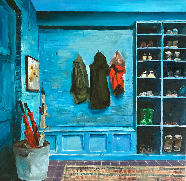 This painting captures a beautifully detailed and cozy entryway, bathed in rich shades of blue. The scene exudes a sense of quiet domesticity, with coats and hats casually hung on the wall, a well-organized shoe rack, and a bucket filled with vibrant red umbrellas, which contrast strikingly against ...