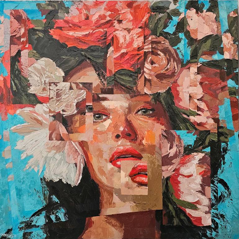 I this painting try to convey the fusion between the delicacy of feminine beauty and the abstract fluidity of shapes. The face emerges among suspended flowers, fragments of a moment captured in time. The turquoise background envelops the composition, enhancing the expressiveness of colors and textur...
