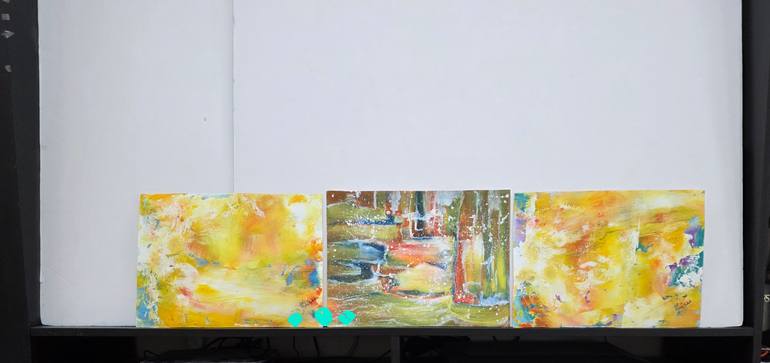 A captivating triptych acrylic painting on watercolor base on paper, a modern triptych that invites contemplation and wonder. Each of the three panels, sized at 36.3cmX 26.7cm, can be framed together as one unified artwork or displayed separately to create a unique visual narrative. This piece evok...