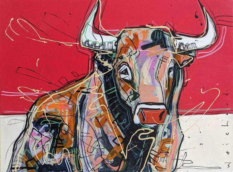 Another bull from my mini series. Painted in mixed media to capture the power and energy of the magnificent bull.