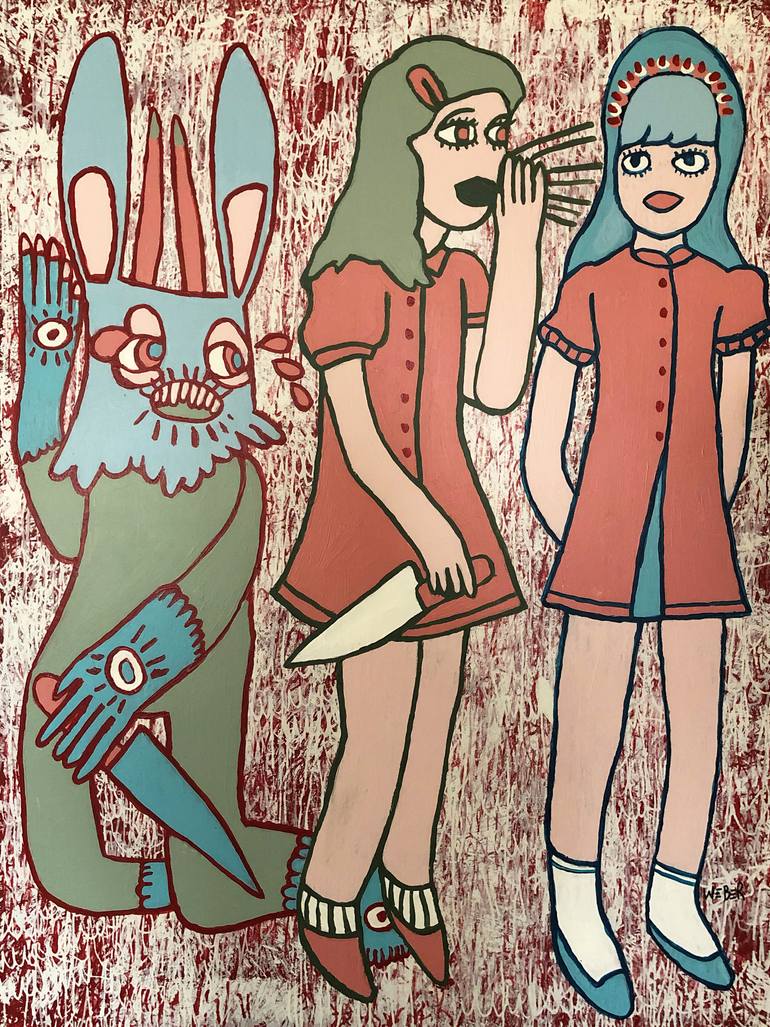 This painting was made in the course of one day from sunrise to sunset in the artist's front yard. This panel is #1 of 6 panels that make up the entire piece titled "Big Fat Fallacy". Anthony Weber is an artist from Milwaukee Wisconsin. Weber utilizes strong, colorful, crude, cartoon-like imagery...