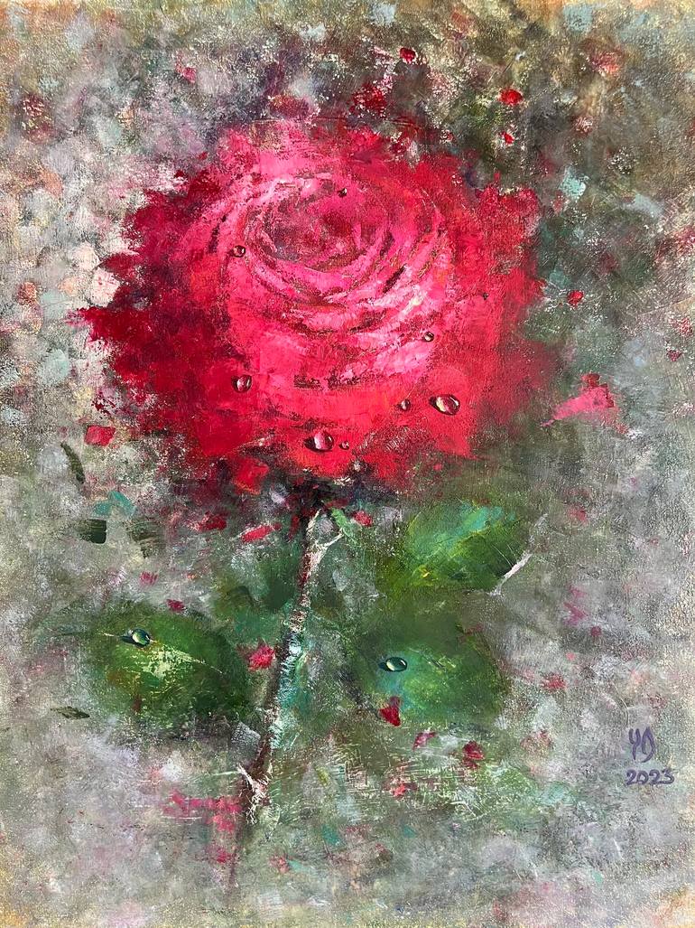 Big Red-Pink Rose Painting with Dew Drop – Floral Still Life, Blown Blossom, Impasto Textured Art in Gray-Green, Red, Pink, Magenta Wine, Scarlet Tones. This original oil painting captures a vibrant red-pink rose emerging against a soft, misty gray-green background. Painted with impasto technique...