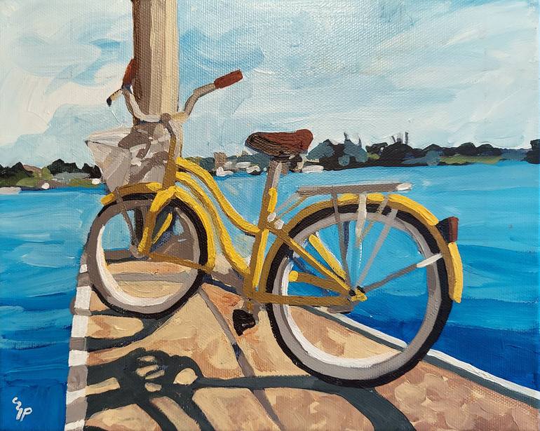 Bike left on a gravel pier on the Gulf Coast of Florida where the water is the color of turquoise.