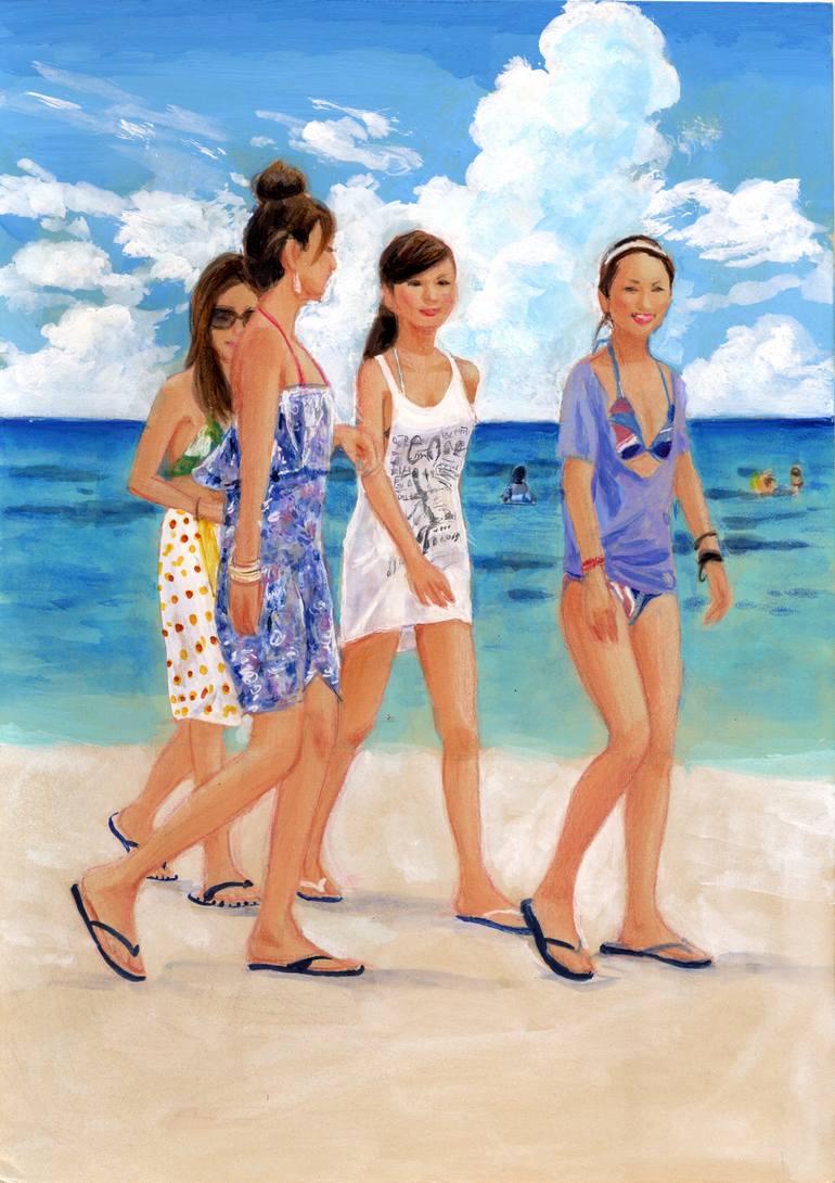 Born in Nagoya, Japan - grew up in the US and Japan. Graduated Musashino Art University, Tokyo - BA (Hons) in Visual Design and Oil Painting. While still at University, I started working in the TV industry in Art and Set design; and also appeared regularly on-camera as a singing KAMISHIBAI picture-storyteller for Channel 5 TV. In 1992, I started working as a freelance artist and illustrator. In between drawing for various magazines, advertisements, CD covers and commissioned work, I paint and draw to add to my collections for exhibitions. My main theme is 'Everyday Life' which I like to express in many different styles. I like to draw modern day versions of UKIYO-E (paintings of ordinary people and life in the EDO period). As I'm currently based in Japan, most of my work is 'Everyday Life of Japanese People' I want to capture moments and scenes of people enjoying themselves; Art that shows the Life and Vitality of People and Nature! I also love tropical islands such as OKINAWA, so I often paint these too.