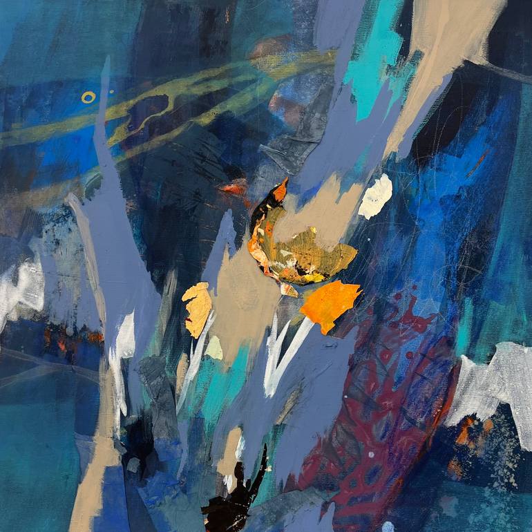 This acrylic painting on canvas features an abstract composition with a deep blue background as its base. The artwork is characterized by a complex interplay of colors and textures. Streaks and patches of turquoise, beige, and light grey create a sense of movement across the canvas. There are also v...
