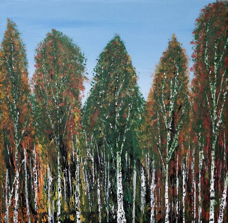 Birch Tree Forest..... Dedicated to the happy environment as the pollution levels have drastically come down due to corona lock-down. Used Acrylic colours with palette knife and brushes on stretched canvas. Hope you enjoy this as much as I enjoyed making it. Edges painted, therefore framing not ...